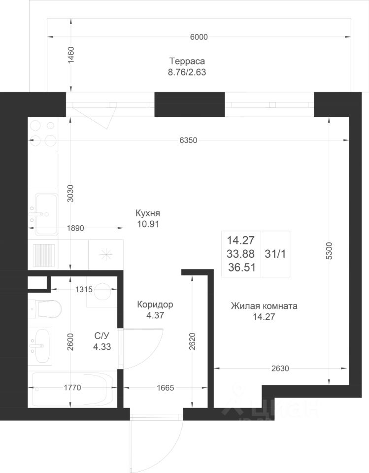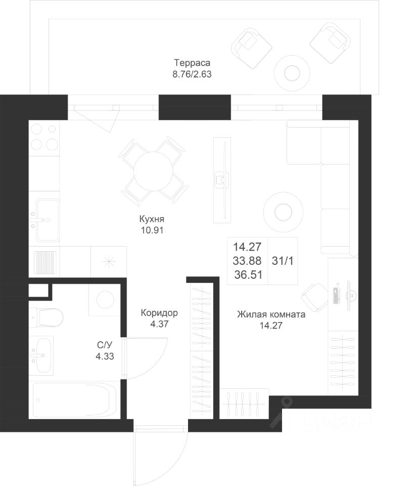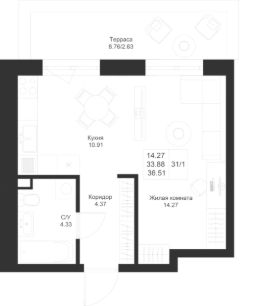 Продается 1-комнатная квартира 31 площадью 36,51 кв.м на 1 этаже в строящемся доме проекта "Новый свет" компании "Ак Барс Дом".