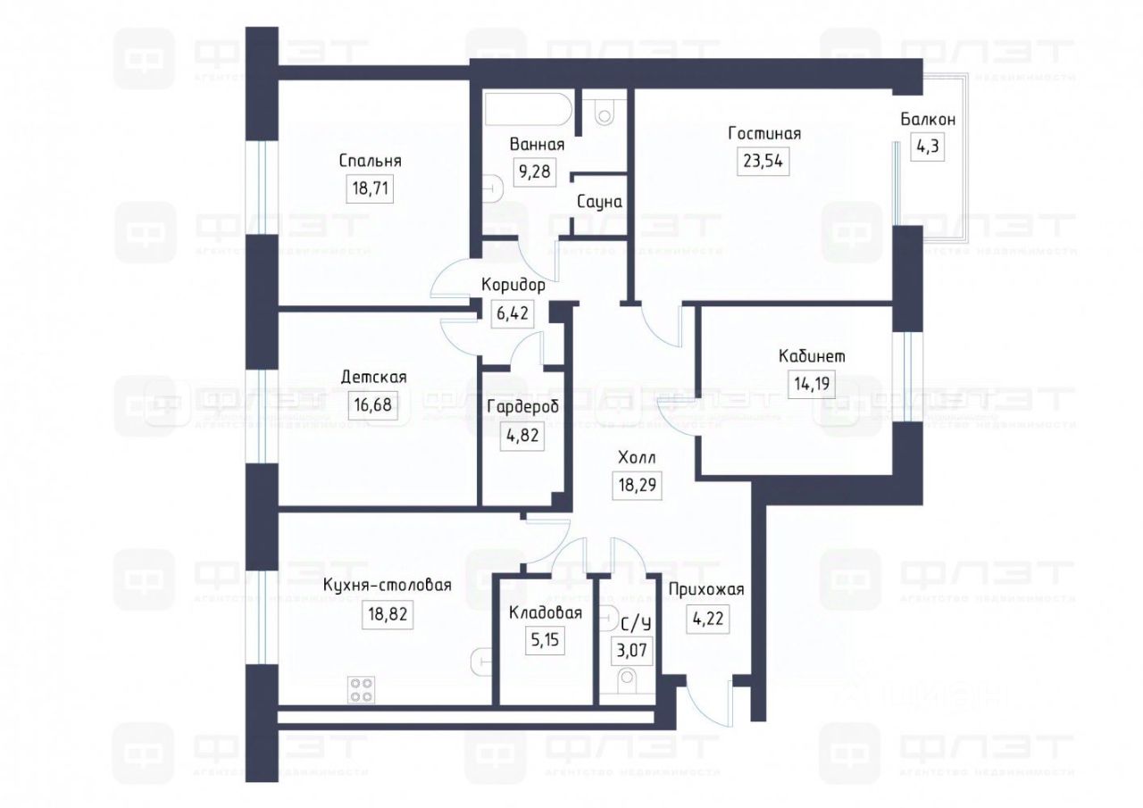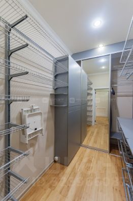 Сама квартира - это одна из самых удачных планировок комплекса: большая кухня-столовая, отдельная гостиная, две изолированные спальни, полноценный кабинет, гардеробная и кладовая. Два санузла, в одном из которых — собственная сауна с финской печью, что делает квартиру по-настоящему уникальной. Высокие потолки (3,2 м) и действительно, большие окна - добавляют воздуха и простора квартире.