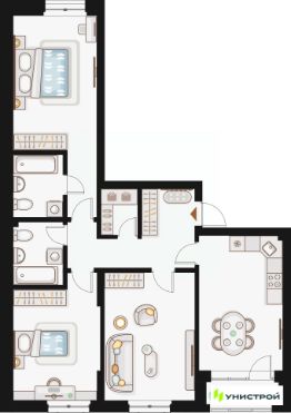 В квартирах выполняется предчистовая отделка с использованием качественных материалов: металлические двери, тепло- и шумоизоляция, энергоэффективные стеклопакеты, скрытая разводка коммуникаций и радиаторы с терморегуляцией.