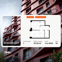 Продаётся 1-комн. квартира площадью 35,2 кв.м на 10 этаже 10 этажного дома (Корпус 2, Секция 8) проекта ПИК Ботаническая 3. Светлый просторный подъезд на уровне земли, функциональная планировка, большие окна, без отделки.