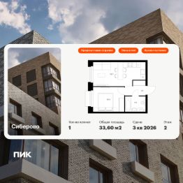 Продаётся 1-комн. квартира площадью 33,6 кв.м на 2 этаже 14 этажного дома (Корпус 2, Секция 6) проекта ПИК Сиберово. Светлый просторный подъезд на уровне земли, функциональная планировка, большие окна, предчистовая отделка.