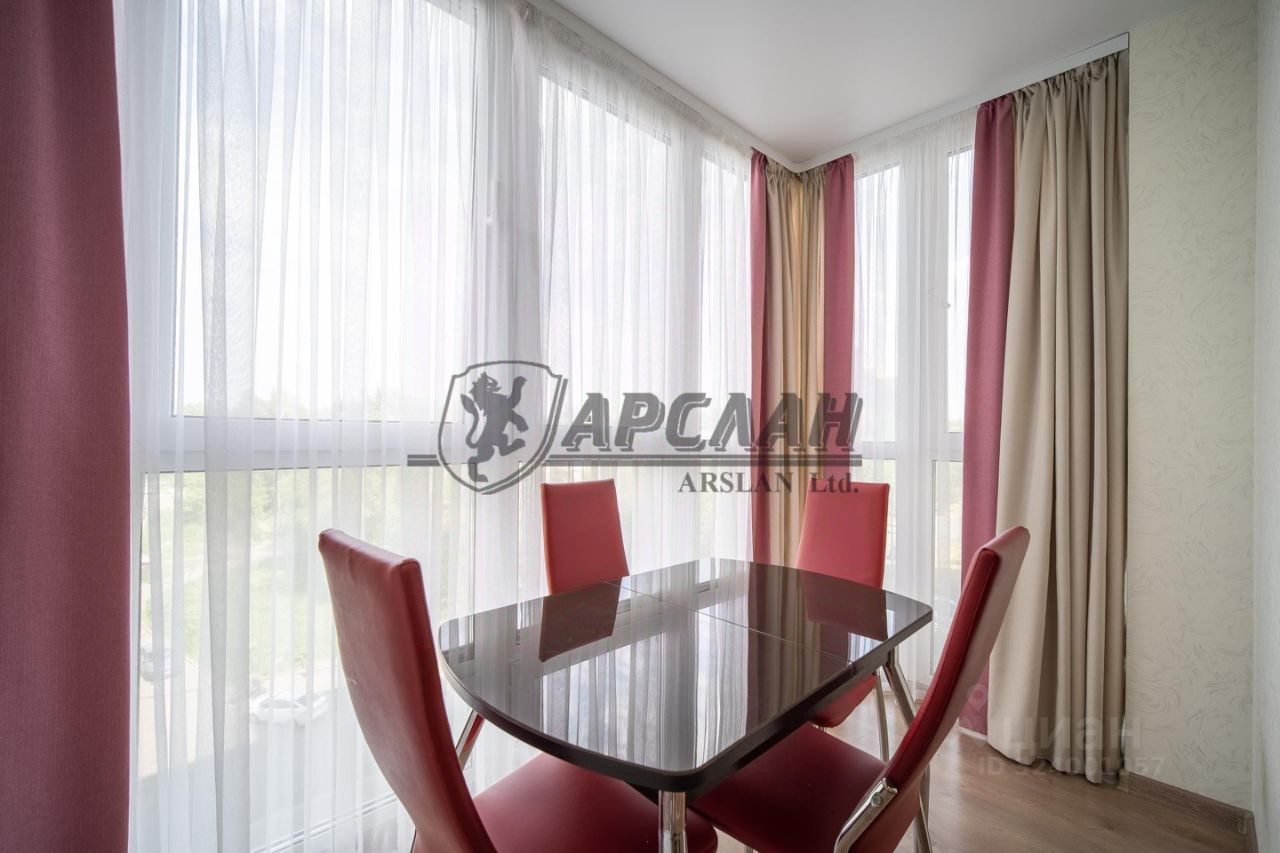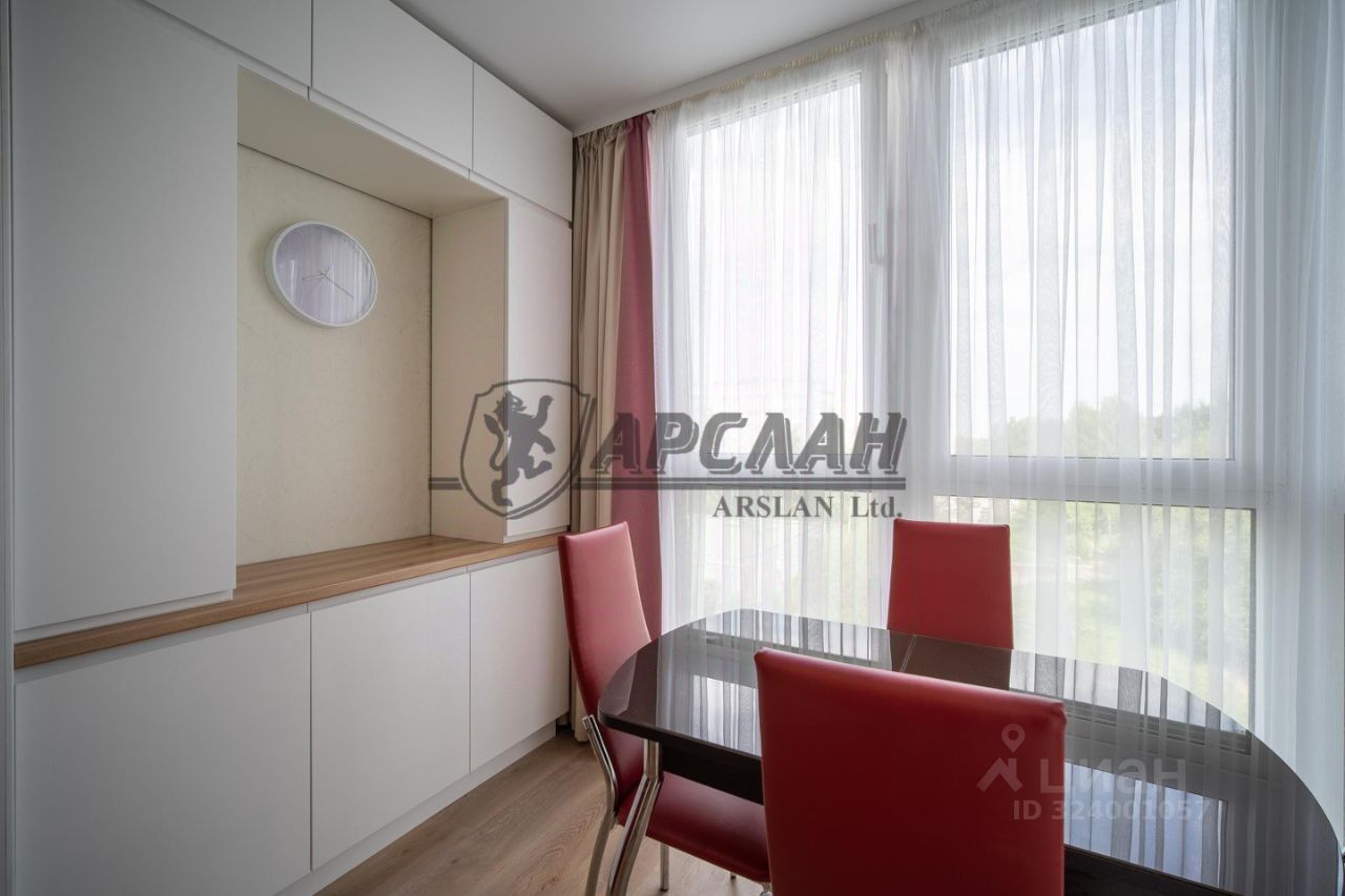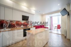 - Просторная кухня-гостиная с обеденной зоной у панорамных окон с видом на город - место, где можно не только готовить, но и собираться за душевными разговорами с близкими.
