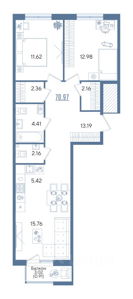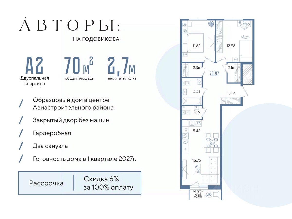 Продается 2-к квартира 7 в образцовом доме "Авторы на Годовикова" в центре Авиастроительного района. Квартира на 2 этаже площадью 70.97 м², кухней-гостиной и высотой потолков 2.7 м. Квартира сдается в предчистовой отделке со стяжкой полов, предоставляя полную свободу для ваших предпочтений в дизайне.