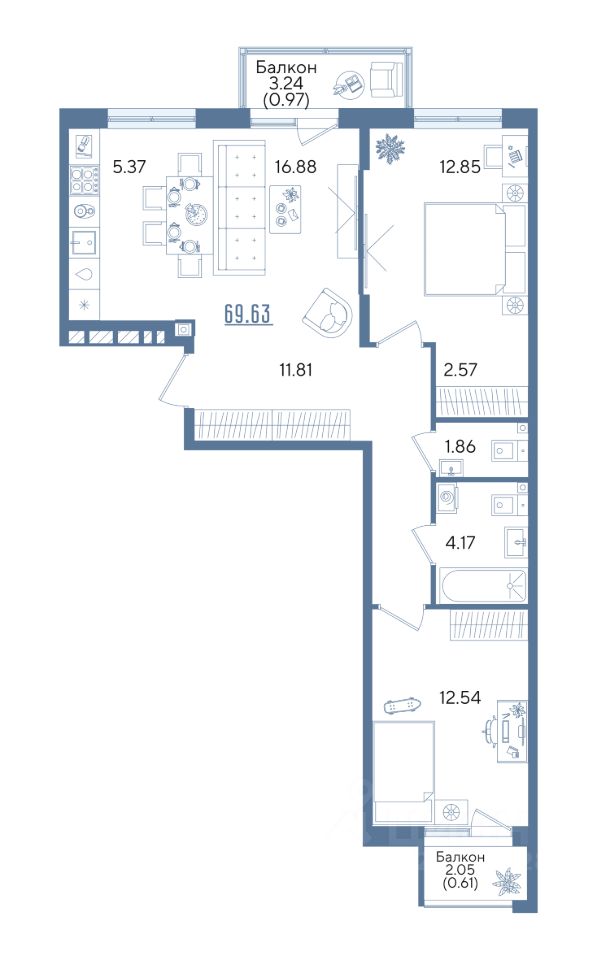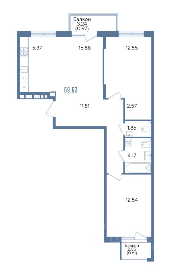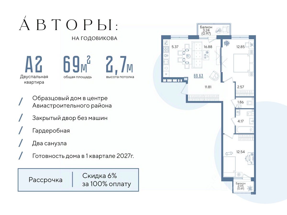 Продается 2-к квартира 91 в образцовом доме "Авторы на Годовикова" в центре Авиастроительного района. Квартира на 2 этаже площадью 69.63 м², кухней-гостиной и высотой потолков 2.7 м. Квартира сдается в предчистовой отделке со стяжкой полов, предоставляя полную свободу для ваших предпочтений в дизайне.