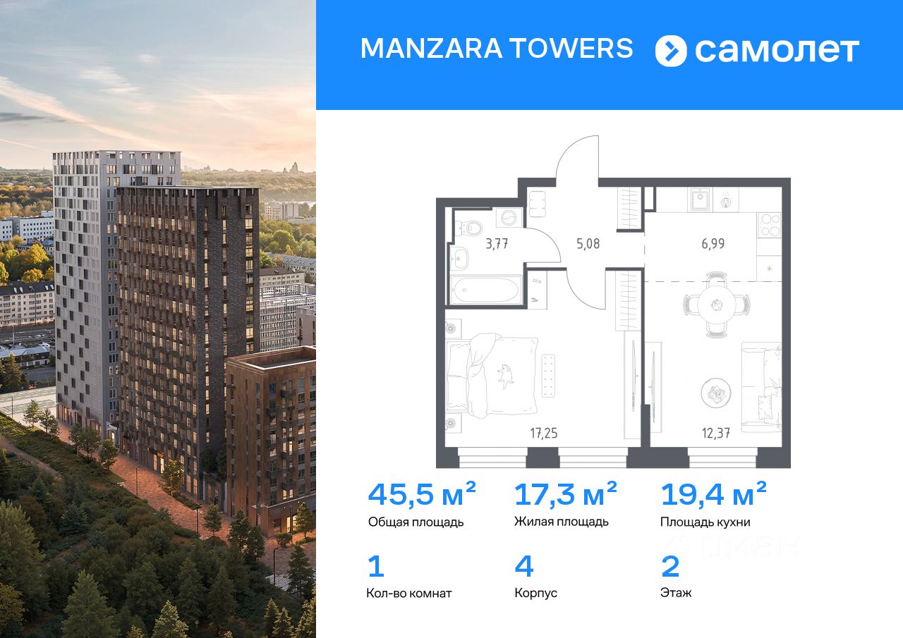 Строим кварталы для жизни с заботой о будущем. Предлагается 1-комнатная квартира комфорт-класса 45,46 кв.м в корпусе 4 на 2 этаже, в MANZARA TOWERS