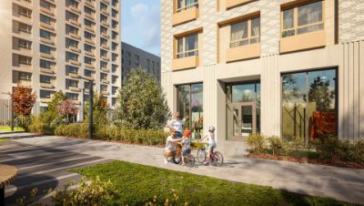 Входы в подъезды в "Сиберово" сделаны на уровне земли: по территории квартала удобно перемещаться и пешком, и на самокате, и с коляской. Первые этажи просторные и светлые: панорамное остекление пропускает много естественного света, а высота потолков доходит до пяти метров.