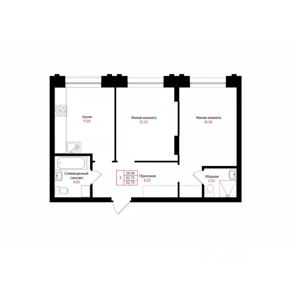 Общая площадь52,75 м²