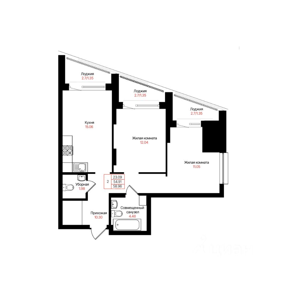 Общая площадь58,96 м²