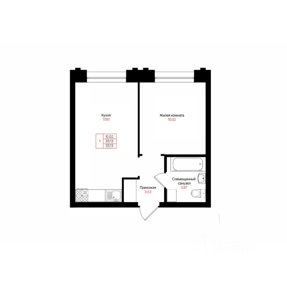 Общая площадь35,13 м²