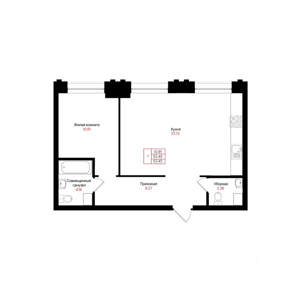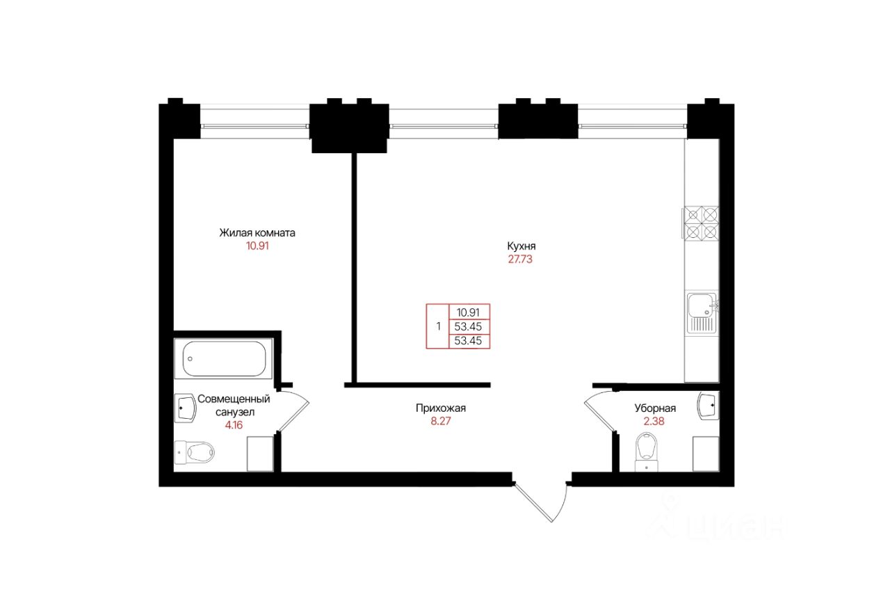 Общая площадь53,45 м²