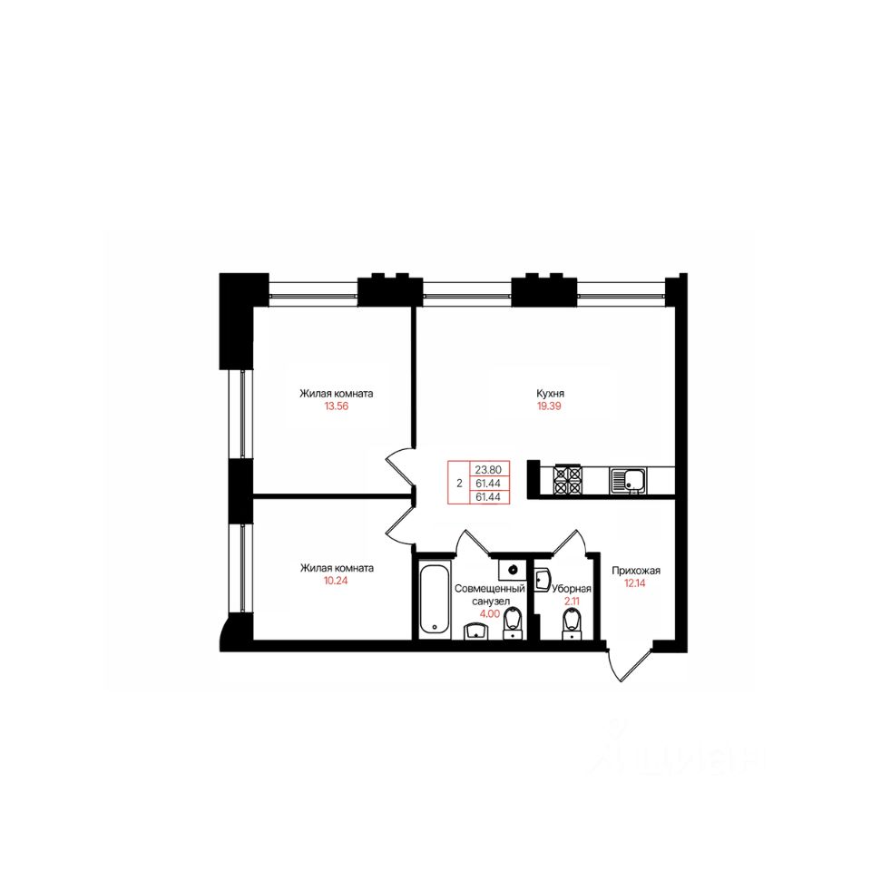 Общая площадь61,44 м²