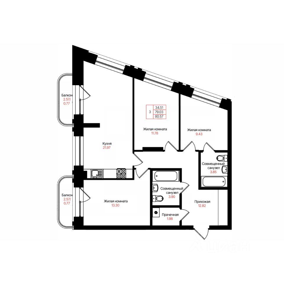 Общая площадь80,57 м²