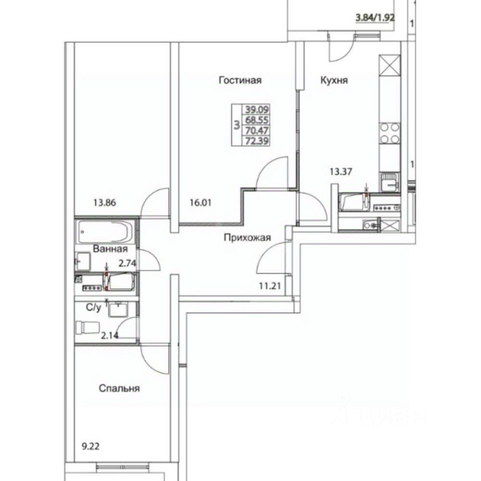 жилая площадь — 42.2 м² ,кухня — 9,3 м².