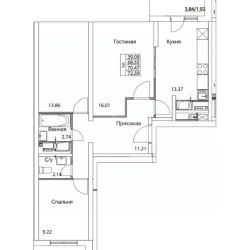 Общая площадь квартиры составляет 64,5 м², из которых