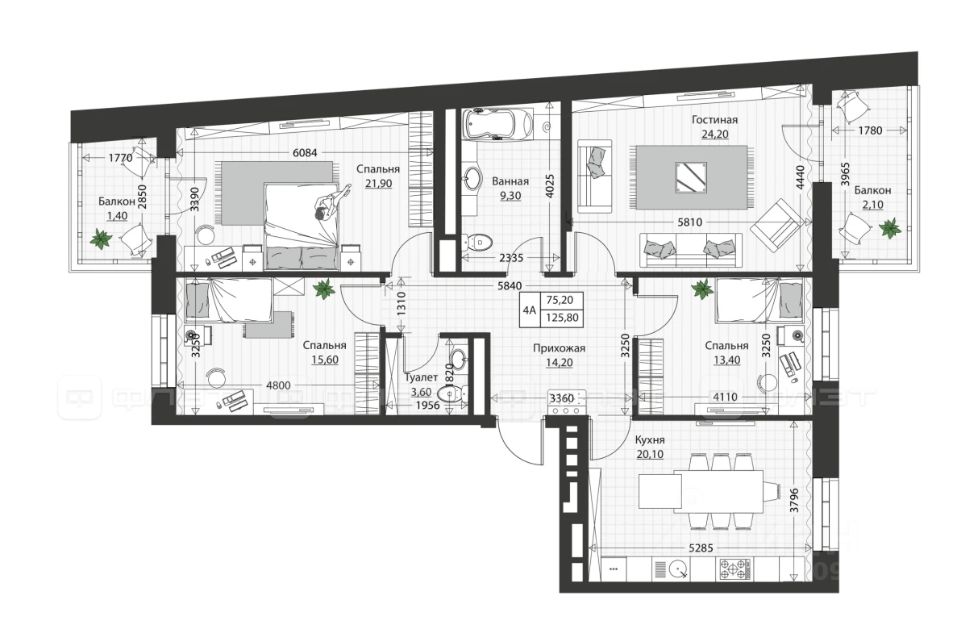 4-комнатная квартира 125.8 м² на 2 этаже в строящемся доме бизнес-класса Жилого комплекса "TRIO".