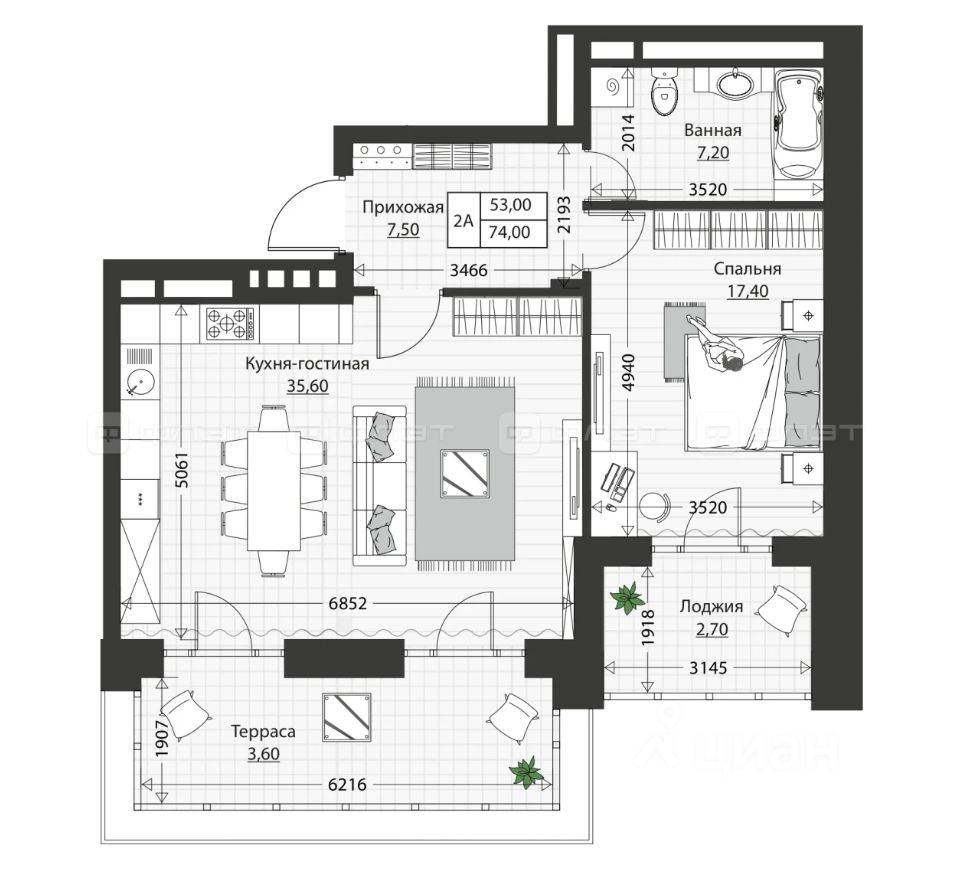 2-комнатная квартира 74 м² на 1 этаже в строящемся доме бизнес-класса Жилого комплекса "TRIO".