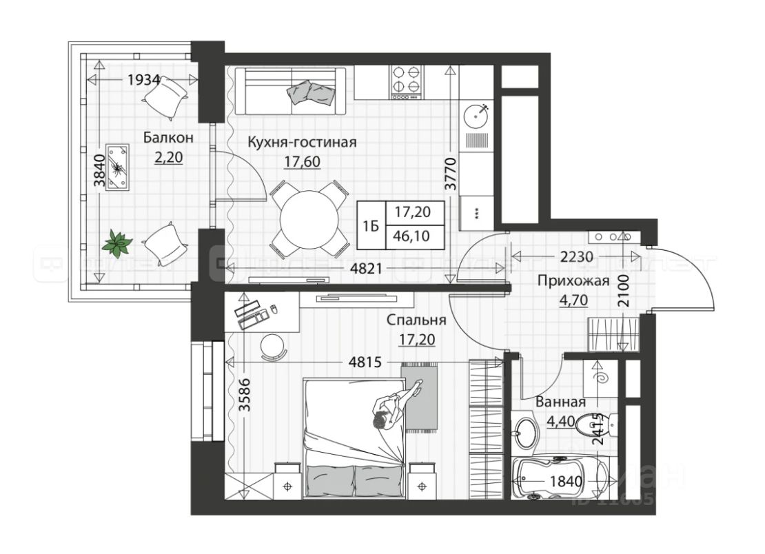 1-комнатная квартира 46.1 м² на 3 этаже в строящемся доме бизнес-класса Жилого комплекса "TRIO".