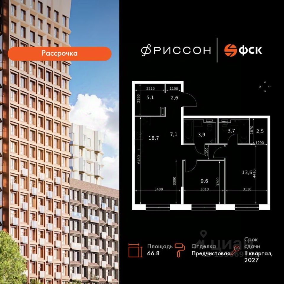 Продаётся 3-к квартира номер 226 общей площадью 66.8 кв.м. на 10-м этаже 19 этажного здания. Отделка Whitebox. Цена с учётом скидки.