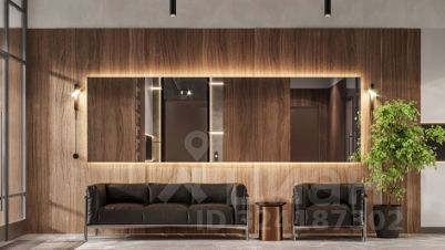 Кухонный гарнитур предусмотрен в нише, чтобы зрительно скрыть рабочие процессы. Высокие потолки 2, 7 м и прихожая, в которой предусмотрена ниша для гардеробной.