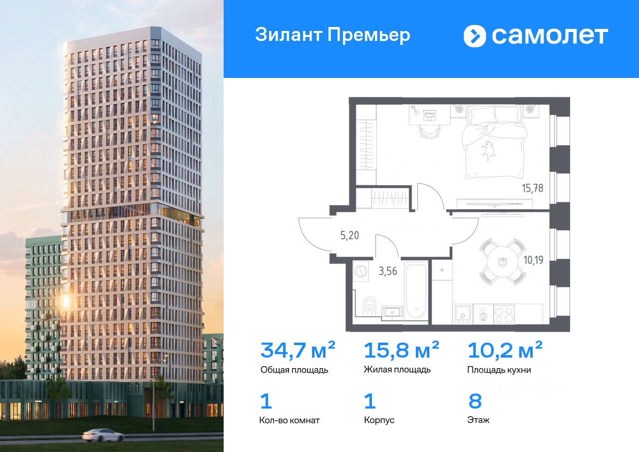 Строим кварталы для жизни с заботой о будущем. Предлагается 1-комнатная квартира комфорт-класса 34,73 кв.м в корпусе 1 на 8 этаже, в ЖК "Зилант Премьер"