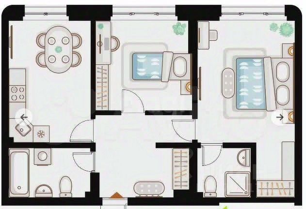 Удобное расположение санузлов и изолированных комнат — идеальный вариант для семьи с детьми либо для аренды.