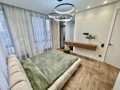 - мастер-спальня 17,51 кв.м. с кондиционером, оснащенной гардеробной, собственным санузлом с ванной и окном, двуспальной кроватью, шторами с электроприводом, а так же выходом на лоджию с видом во двор и мост Миллениум;