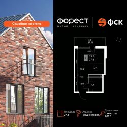 Продаётся квартира-студия номер 43 общей площадью 27.8 кв.м. на 5-м этаже 7 этажного здания. Отделка Whitebox. Цена с учётом скидки.