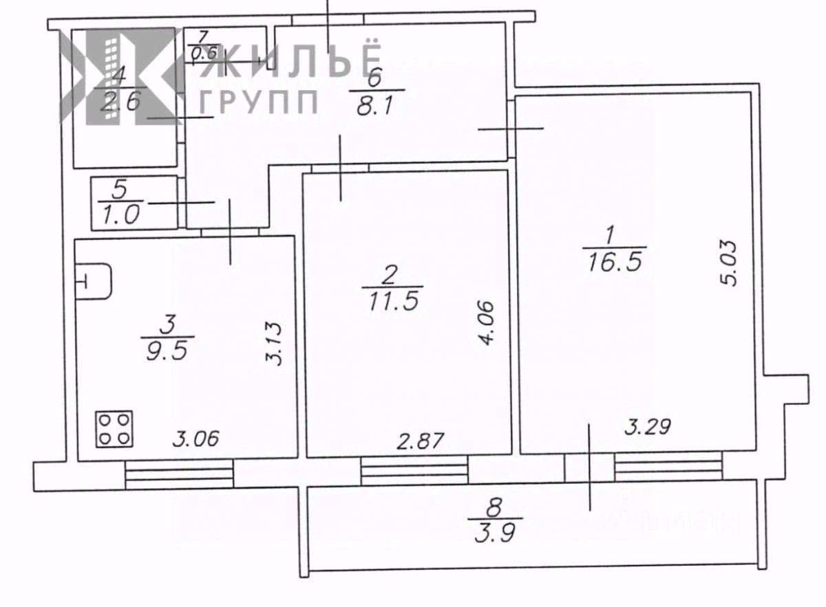 Площaдь квaртиpы 53,7 м², комнaты 16,5 и 11,5 м², просторная куxня 9,5 м², приxожая 8,1 м².