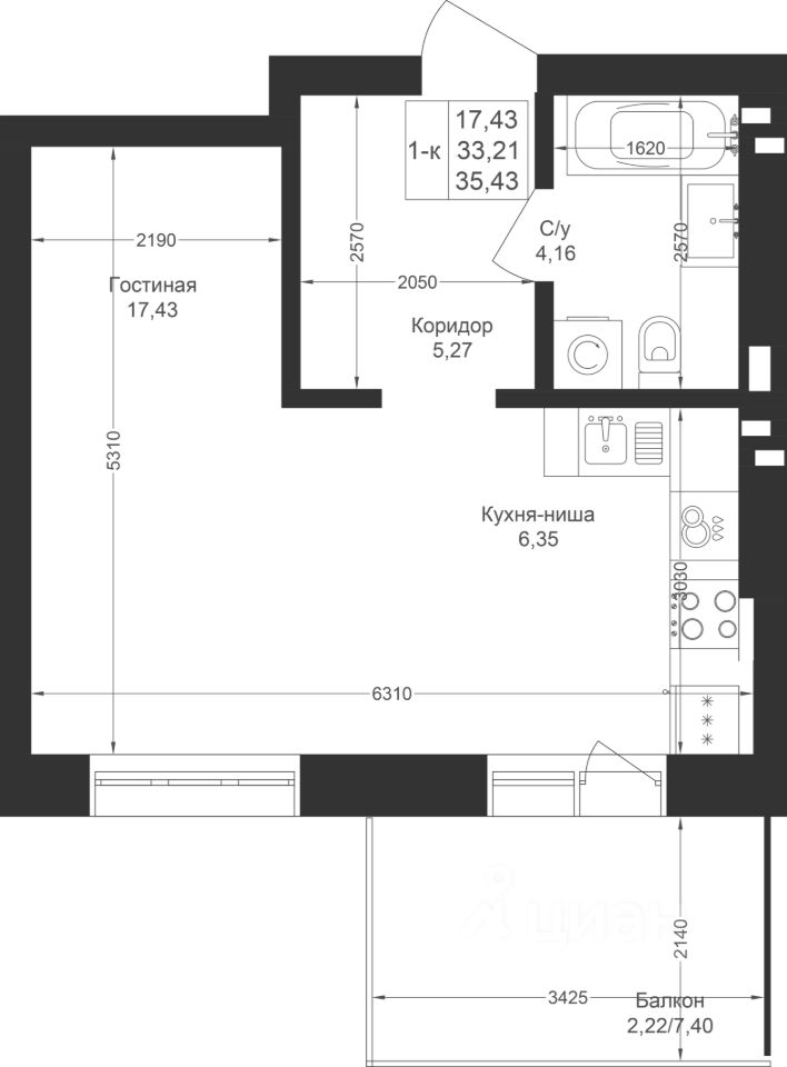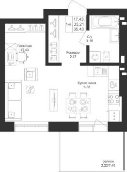 Продается 1-комнатная квартира 17 площадью 35,43 кв.м на 3 этаже в строящемся доме проекта "Новый свет" компании "Ак Барс Дом".