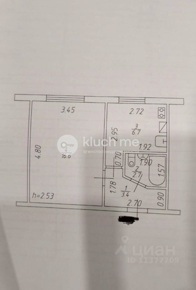 Общая площадь 30 м2, кухня 6,7 м2, жилая 16,6 м2.