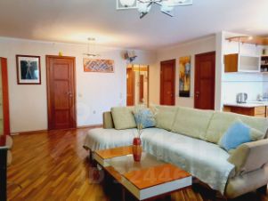 Квартира общей площадью с учётом лоджий 82м2. Остаётся всё необходимое, мебель и техника.