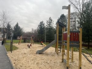 Придомовая территория огорожена, въезд через шлагбаум. На территории имеются прогулочные аллеи, детская площадка и спортивная площадка.
