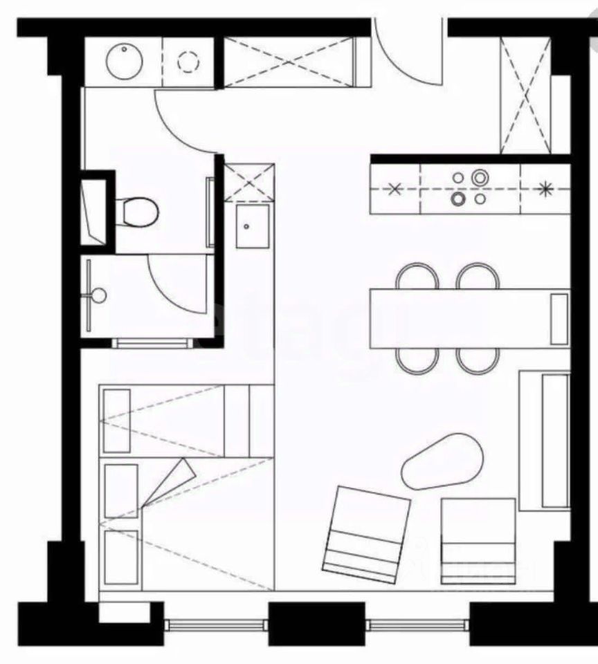 Умная планировка: Несмотря на скромные метры, здесь есть всё для комфортной жизни. Четкое зонирование отделяет спальную зону от гостиной.