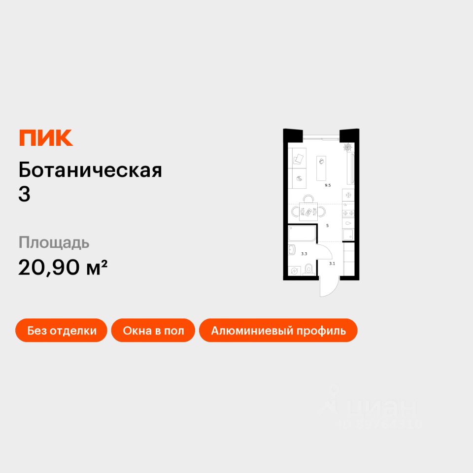 Продаётся квартира-студия площадью 20,9 кв.м на 11 этаже 15 этажного дома (Корпус 2, Секция 9) проекта ПИК Ботаническая 3. Светлый просторный подъезд на уровне земли, функциональная планировка, большие окна, без отделки.