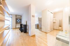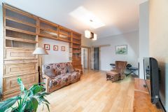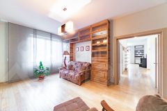 Пол по всей квартире - массив дуба. Окна на улицу, видна река. В гостинной панорамные окна.