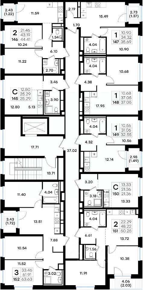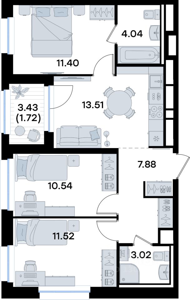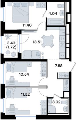 Продается 3-комн. квартира на 5-м этаже в строящемся проекте GloraX Экосити. Общая площадь лота составляет 63,63 кв. м, из которых 33,46 кв. м отведено под жилую и 13,51 кв. м под кухонную зону. Номер квартиры - 152
