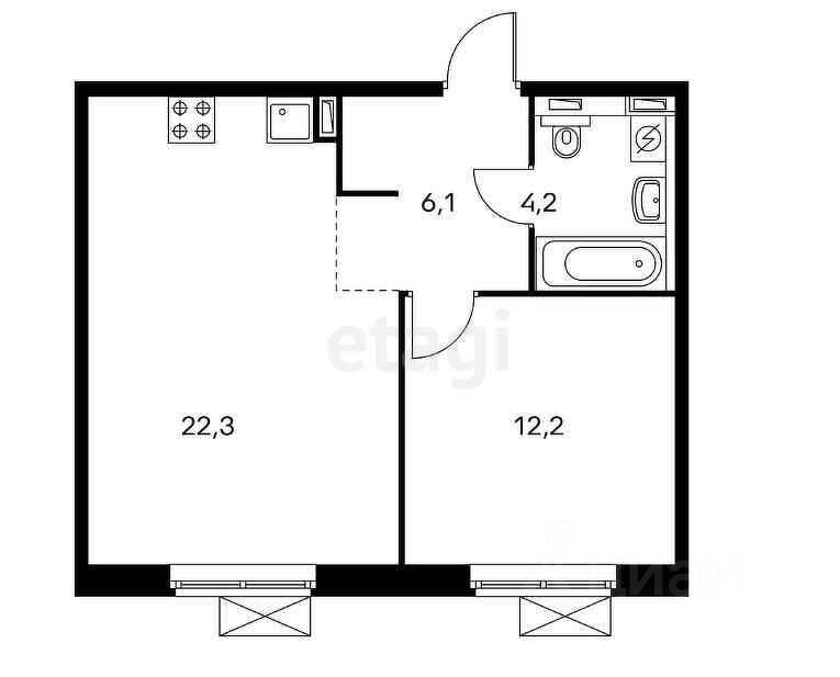Эргономически очень удобная планировка квартиры, нет пустых коридоров. Общая площадь: 44 м². Просторный панорамный балкон.