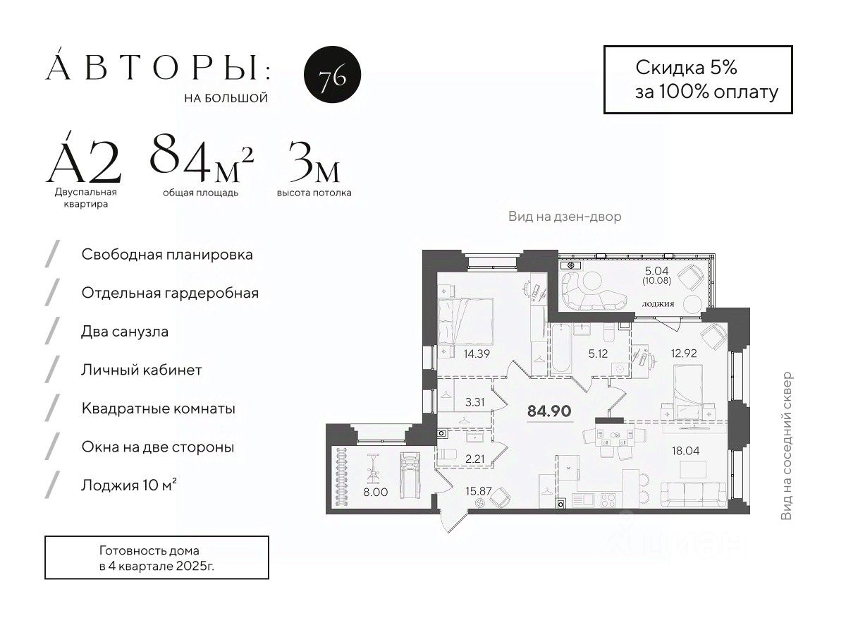 Продается видовая 3-к квартира 11 в клубном доме "Авторы на Большой 76". Квартира с двумя спальнями на 4 этаже площадью 84.9 м², кухней-гостинной площадью 18.04 м², высотой потолков 3 м и двумя санузлами. Окна выходят на две стороны и открывают вид на дзен-двор с обильным озеленением. Квартира сдается в свободной планировке, предоставляя полную свободу для ваших предпочтений в дизайне и возможность подстроить пространство под ваши жизненные ценности.