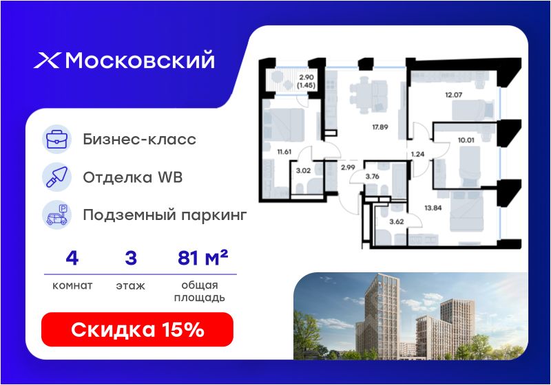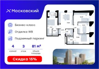 Продается 4-комн. квартира на 3-м этаже в квартале бизнес-класса Московский. Общая площадь лота составляет 81,50 кв. м, из которых 47,53 кв. м отведено под жилую и 17,89 кв. м под кухонную зону. Номер квартиры - 207