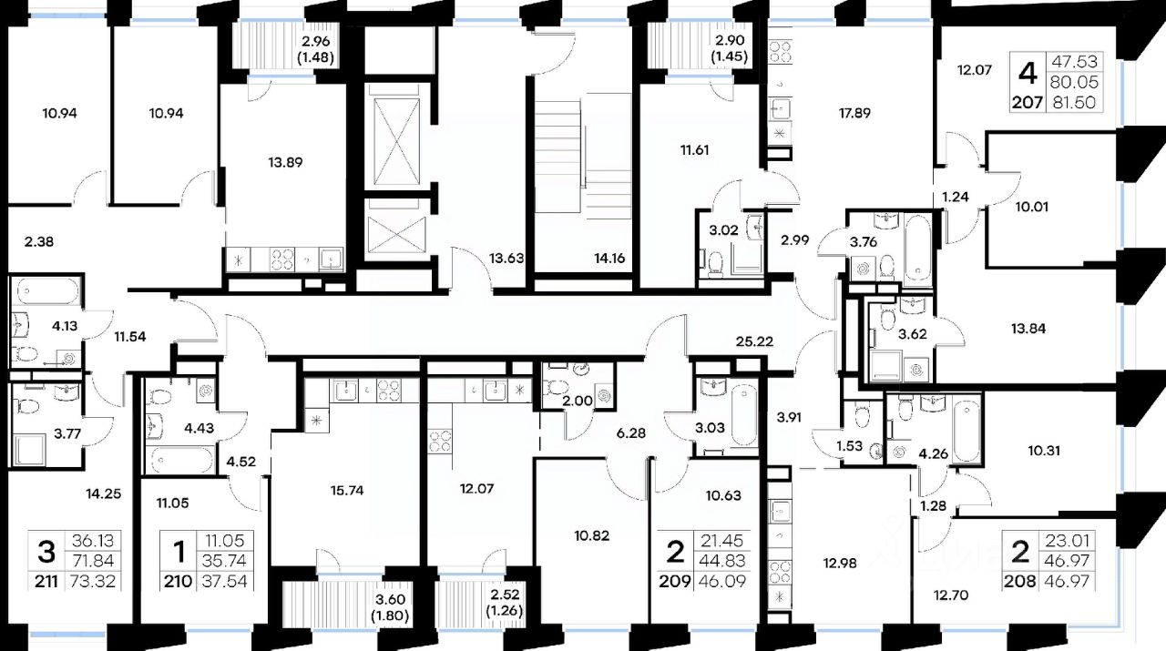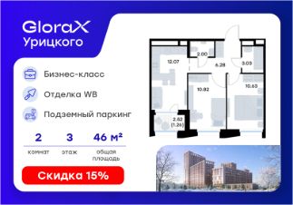 Продается 2-комн. квартира на 3-м этаже в квартале бизнес-класса GloraX Урицкого. Общая площадь лота составляет 46,09 кв. м, из которых 21,45 кв. м отведено под жилую и 12,07 кв. м под кухонную зону. Номер квартиры - 209