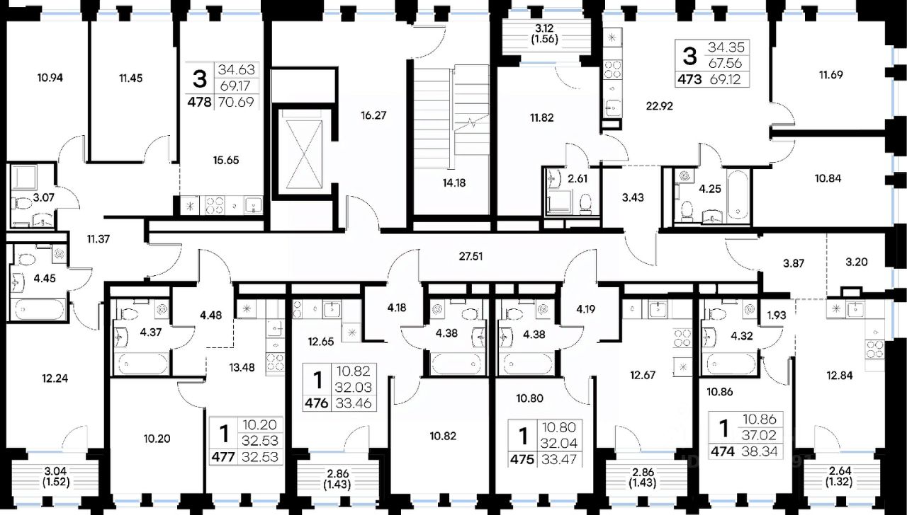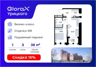 Продается 1-комн. квартира на 3-м этаже в квартале бизнес-класса GloraX Урицкого. Общая площадь лота составляет 38,34 кв. м, из которых 10,86 кв. м отведено под жилую и 12,84 кв. м под кухонную зону. Номер квартиры - 474