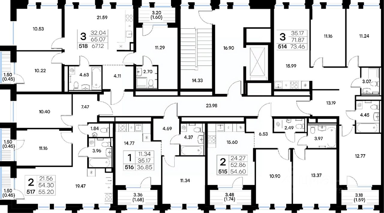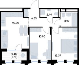 Продается 2-комн. квартира на 3-м этаже в квартале бизнес-класса GloraX Урицкого. Общая площадь лота составляет 54,60 кв. м, из которых 24,27 кв. м отведено под жилую и 15,60 кв. м под кухонную зону. Номер квартиры - 515
