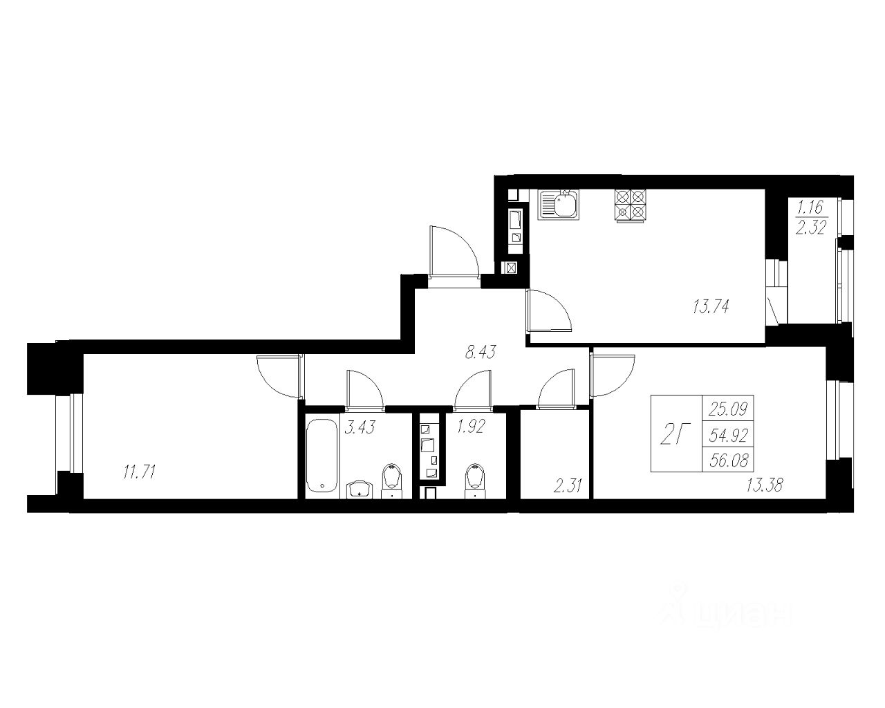 Продаётся 2-комнатная квартира 140 общей площадью 56.08 кв.м., на 7 этаже 13 этажного дома.