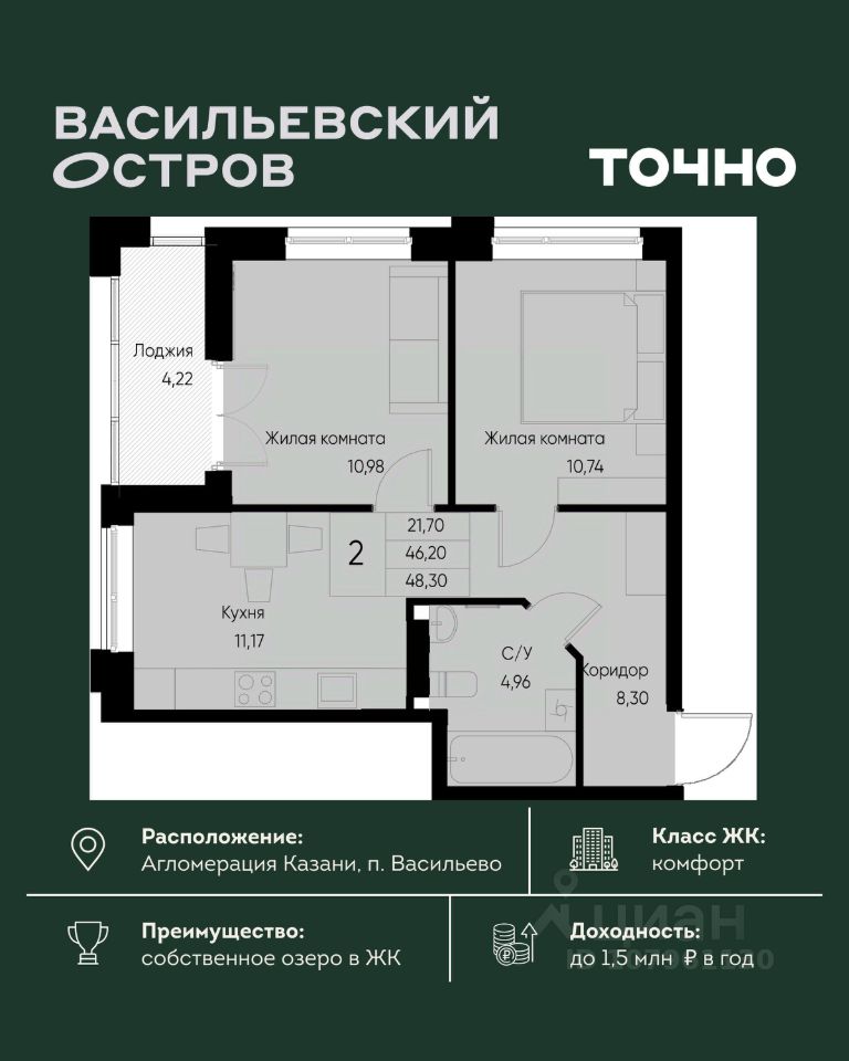 ЖК "Васильевский остров" — масштабный проект ТОЧНО в Казанской агломерации. Просторная территория 88 Га спроектирована для комфортной жизни: озеро с набережной и пляжем, каток, зелёные маршруты. В проекте комплекса — школа на 1 224 места, 2 детских сада на 680 мест, детская и взрослая поликлиники, фитнес-центр с бассейном, термальный комплекс, фермерский рынок, магазины, кафе и рестораны.
