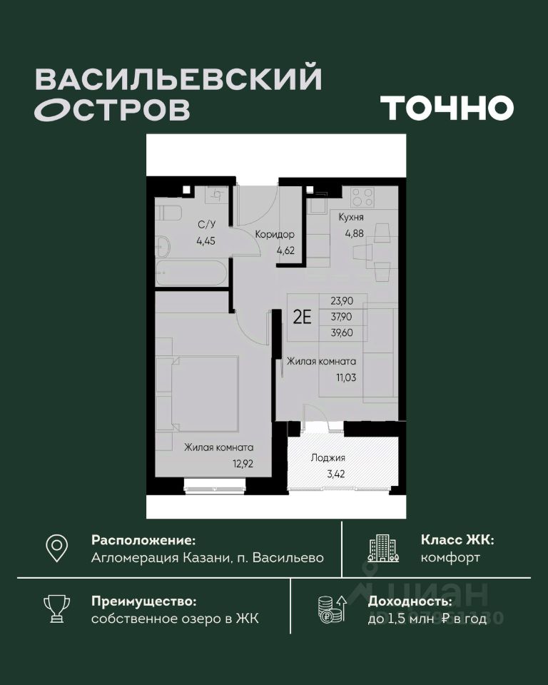 ЖК "Васильевский остров" — масштабный проект ТОЧНО в Казанской агломерации. Просторная территория 88 Га спроектирована для комфортной жизни: озеро с набережной и пляжем, каток, зелёные маршруты. В проекте комплекса — школа на 1 224 места, 2 детских сада на 680 мест, детская и взрослая поликлиники, фитнес-центр с бассейном, термальный комплекс, фермерский рынок, магазины, кафе и рестораны.