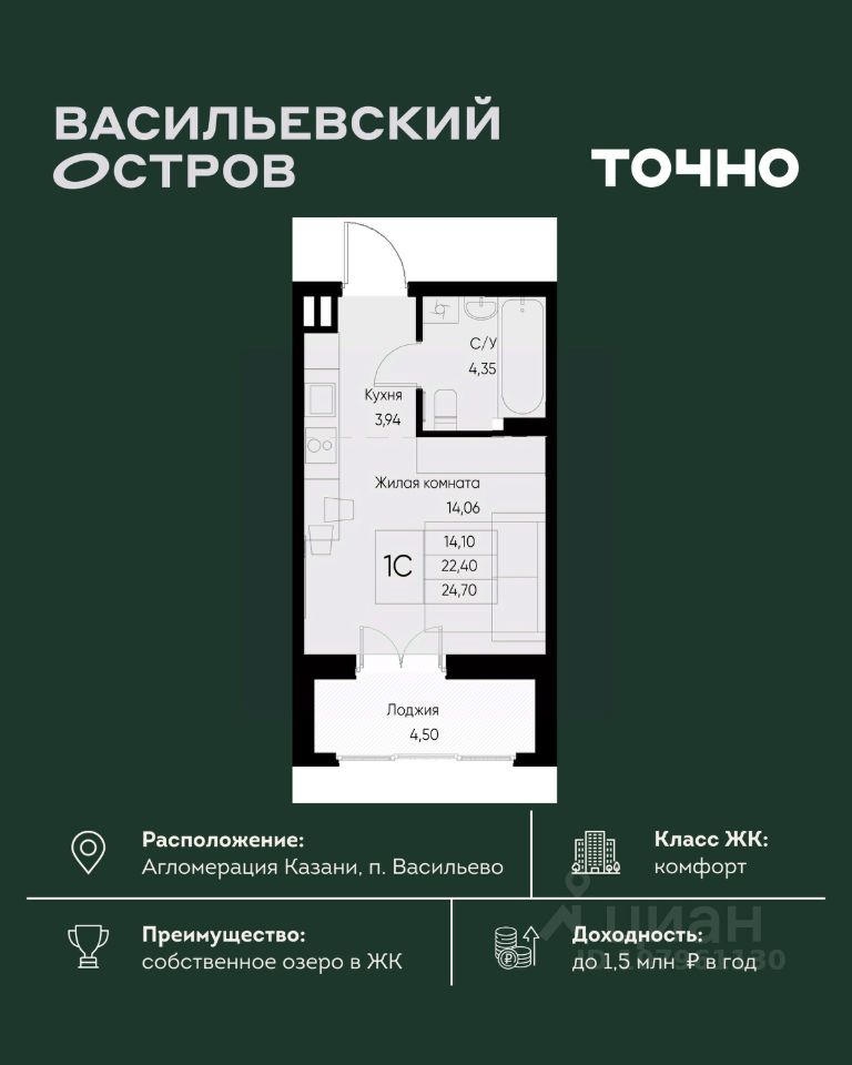ЖК "Васильевский остров" — масштабный проект ТОЧНО в Казанской агломерации. Просторная территория 88 Га спроектирована для комфортной жизни: озеро с набережной и пляжем, каток, зелёные маршруты. В проекте комплекса — школа на 1 224 места, 2 детских сада на 680 мест, детская и взрослая поликлиники, фитнес-центр с бассейном, термальный комплекс, фермерский рынок, магазины, кафе и рестораны.