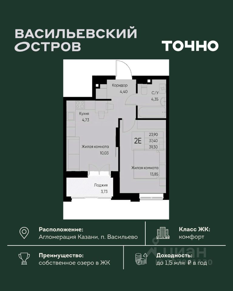 ЖК "Васильевский остров" — масштабный проект ТОЧНО в Казанской агломерации. Просторная территория 88 Га спроектирована для комфортной жизни: озеро с набережной и пляжем, каток, зелёные маршруты. В проекте комплекса — школа на 1 224 места, 2 детских сада на 680 мест, детская и взрослая поликлиники, фитнес-центр с бассейном, термальный комплекс, фермерский рынок, магазины, кафе и рестораны.