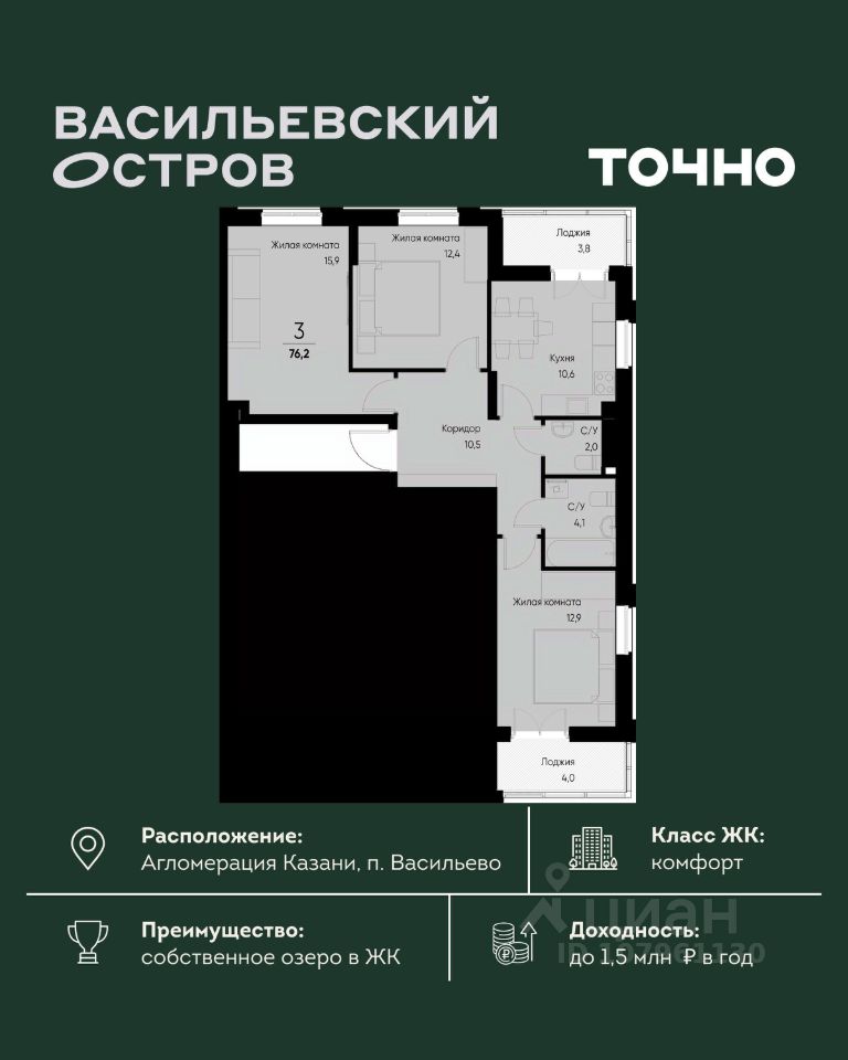 ЖК "Васильевский остров" — масштабный проект ТОЧНО в Казанской агломерации. Просторная территория 88 Га спроектирована для комфортной жизни: озеро с набережной и пляжем, каток, зелёные маршруты. В проекте комплекса — школа на 1 224 места, 2 детских сада на 680 мест, детская и взрослая поликлиники, фитнес-центр с бассейном, термальный комплекс, фермерский рынок, магазины, кафе и рестораны.