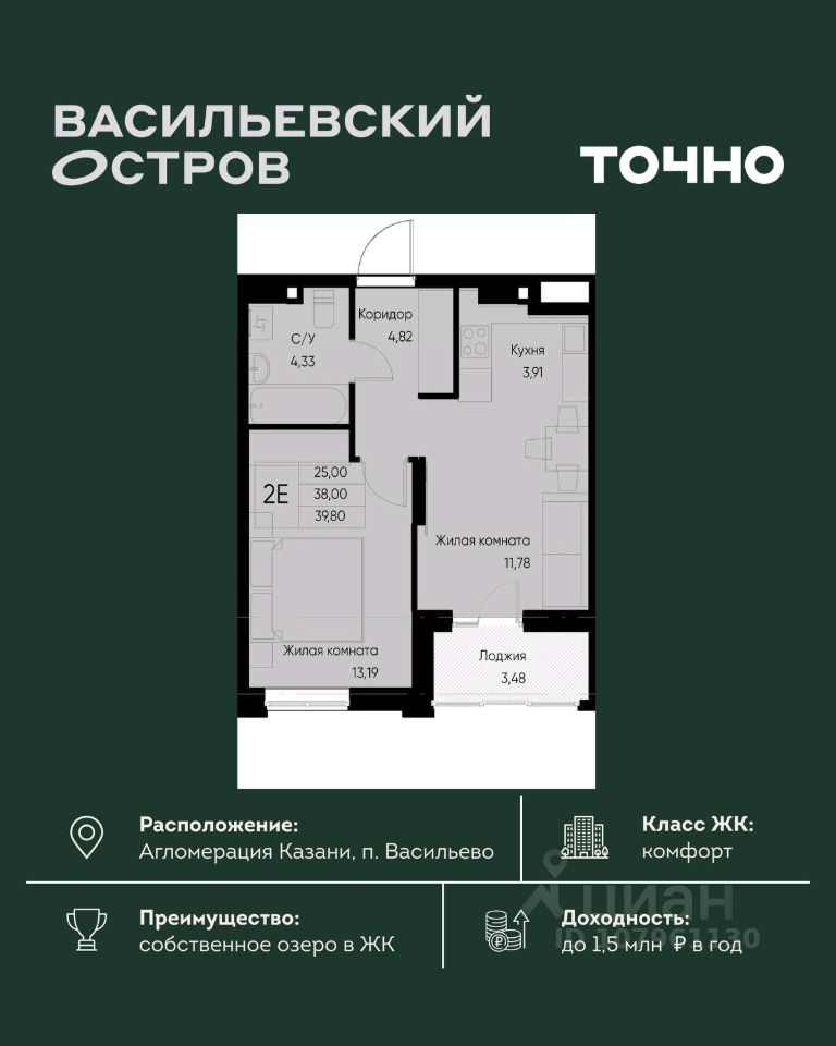 ЖК "Васильевский остров" — масштабный проект ТОЧНО в Казанской агломерации. Просторная территория 88 Га спроектирована для комфортной жизни: озеро с набережной и пляжем, каток, зелёные маршруты. В проекте комплекса — школа на 1 224 места, 2 детских сада на 680 мест, детская и взрослая поликлиники, фитнес-центр с бассейном, термальный комплекс, фермерский рынок, магазины, кафе и рестораны.