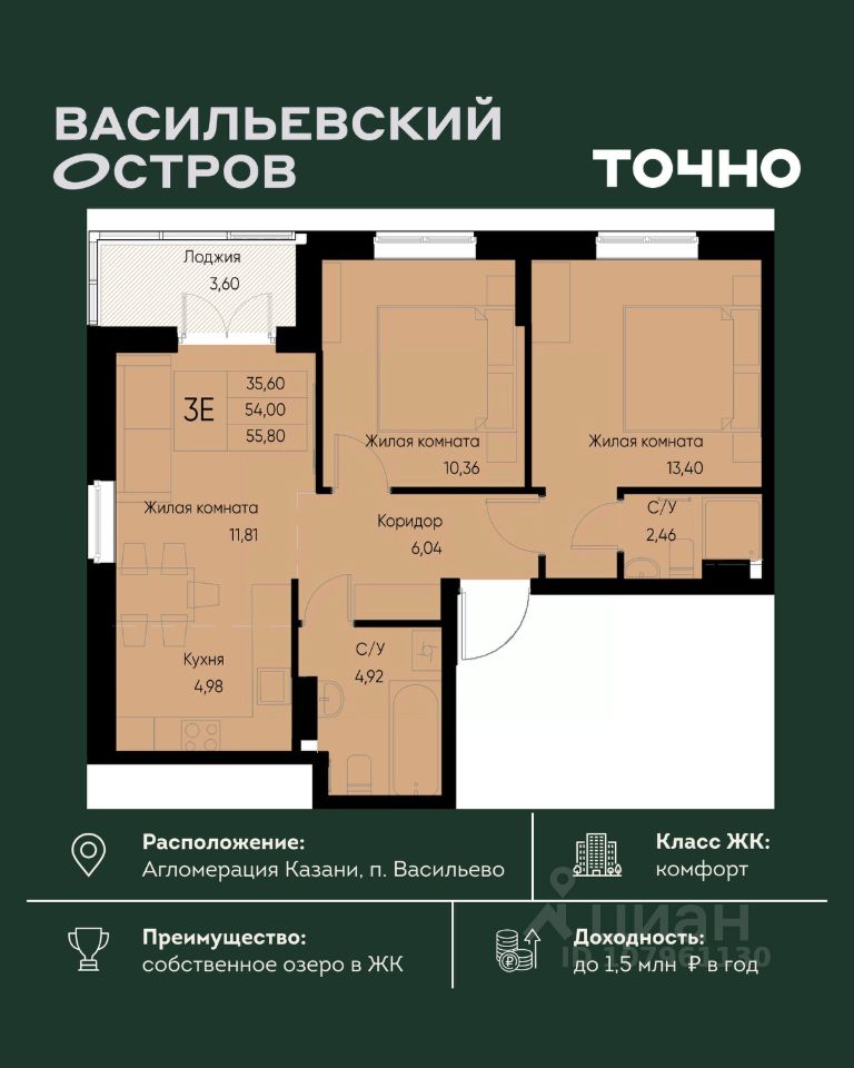 ЖК "Васильевский остров" — масштабный проект ТОЧНО в Казанской агломерации. Просторная территория 88 Га спроектирована для комфортной жизни: озеро с набережной и пляжем, каток, зелёные маршруты. В проекте комплекса — школа на 1 224 места, 2 детских сада на 680 мест, детская и взрослая поликлиники, фитнес-центр с бассейном, термальный комплекс, фермерский рынок, магазины, кафе и рестораны.